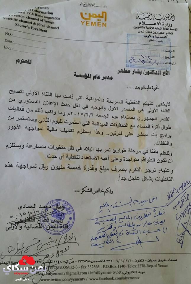 في واحده من الفضائح التي تمتاز بها قناة اليمن الرسميه ، بعد فضائح تحرييف الحقائق ، اقدم رئيس قطاع التليفزيون في تلك القناه على مخاطبة مدير عام المؤسسه العامه للاذاعه والتليفزيون يطالبه بصرف مبلغ 50 مليون وذلك لمواجهة التغطيه المستمره للاعلان الدستوري بالاظافه الى عمل تحقيقات ميدانيه تؤثر على الجماهير اليمنيه ، خصوصآ والبلد تمر بضرف استثنائي ، ويستلزم مواكبة الحدث ووضع الطواقم الاعلاميه والفنيين على اهبة الاستعداد لتغطية مايتم التوجيه به .