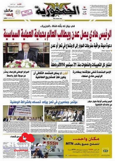 لاول مرة منذ ان الاعلان الحوثي اصدرت صحيفة الجمهورية عددها اليوم كأول عدد مخالفة لسياسة جماعة الحوثي منذ ان اعلنت ما يسمى الاعلان الدستوري.
