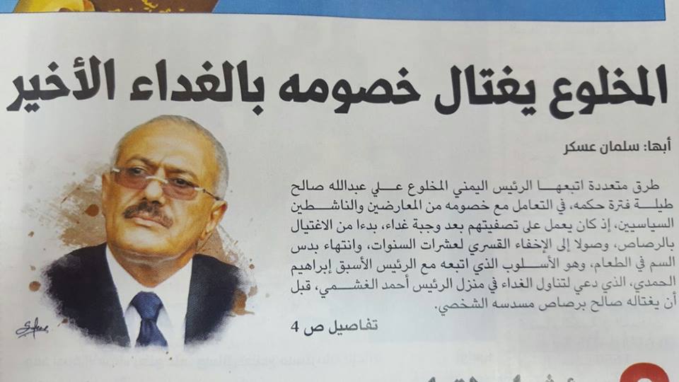 وأشار إلى أن اليمنيين كانوا يعرفون مقتل بعض الشخصيات بمجرد حضورهم مأدبة علي صالح، ومن هذه الأسماء البرلماني عبدالحبيب سالم مقبل الذي كان يعمل صحفيا، وكتب ضد سلوك صالح، وقدم له الأخير دعوة غداء ومات بعدها بساعات.