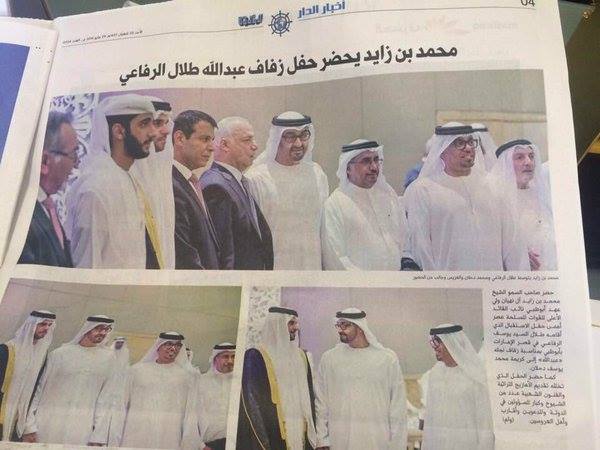واهتمت وسائل الإعلام الإماراتية بخبر حضور “بن زايد” عصر السبت، حفل الاستقبال الذي أقامه طلال السيد يوسف الرفاعي في قصر الامارات بأبوظبي بمناسبة زفاف نجله ” عبدالله ” إلى ابنة دحلان.