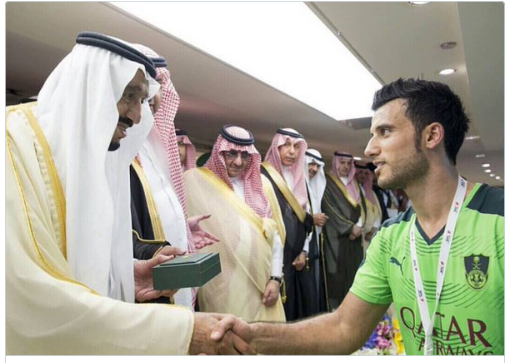 نشر عمر السومة، لاعب الفريق الأول لكرة القدم بالنادي الأهلي السعودي، صورة لحظة استلامه ميدالية الفوز بلقب كأس خادم الحرمين الشريفين من الملك سلمان.