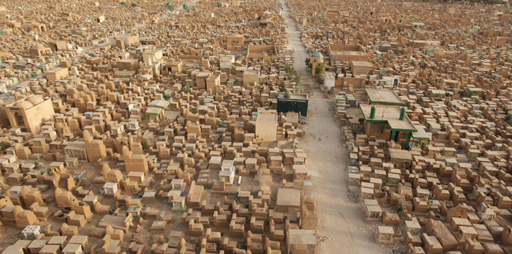 على مد البصر ترى القبور وشواهدها والرموز الشيعية المستمرة في خطوط طويلة، هذه هي مقبرة وادي السلام، أكبر مقبرة في العالم وتقع في محافظة النجف العراقية.