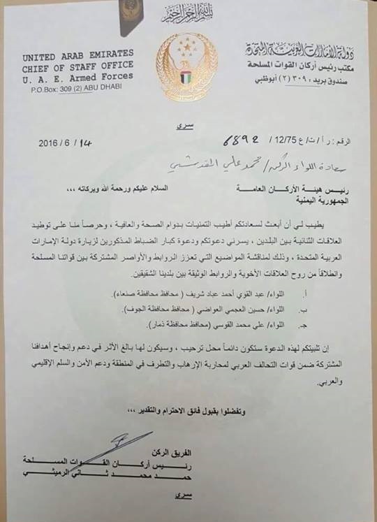 وجهت رئاسة أركان الجيش الإماراتي دعوة لرئيس الأركان في اليمن اللواء محمد علي المقدشي وثلاثة محافظين يمنيين لزياتها إلى أبوظبي .