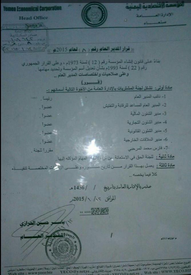 هذا وقد قام مدير المؤسسة في شهر سبتمبر اي بعد اقتحام صنعاء من قبل مليشيات الحوثي بتكليف احد عناصر الحوثي نائبا له بطريقة مخالفه لقانون انشاء المؤسسة وصرف له سيارة صالون مونيكا وسيارة جيب وطقم واعتماد مالي ضخم له ولمرافقبه اضافة الى معلومات لم يتم التاكد منها بعد شراء فيلا للشامي بمبلغ أربعمائة وخمسون مليون في منطقة حده.