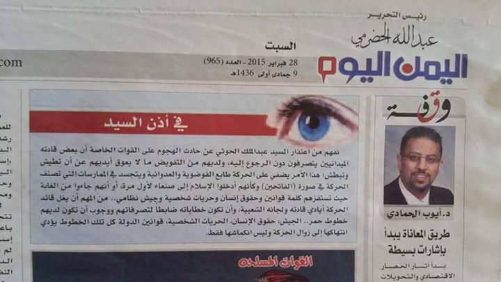 وقالت الصحيفة باستحياء واستعطاف، نفهم من اعتذار الحوثي عن حادث الهجوم على القوات الخاصة ان بعض قادته الميدانيين يتصرفون دون الرجوع اليه ولديهم من التفويض ما لا يعوق ايديهم عن ان تطيش وتبطش.