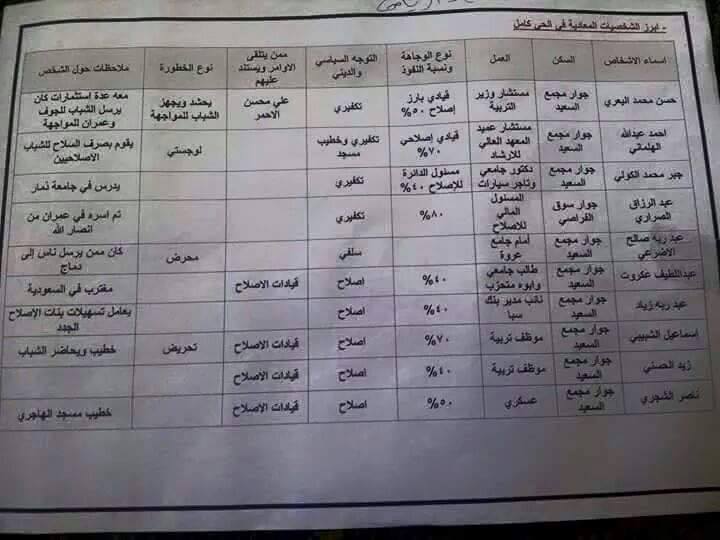 تداول ناشطون على شبكات التواصل الاجتماعي الفيسبوك وثائق سرية كيف يقتحم الحوثي المناطق والحارات والمديريات اسماء وتفاصيل القيادات الحزبية والقبلية والدينية ومدى تاثيرها ومعلومات دقيقة عن من يسكن الاحياء والحارات، معلومات استخباراتية عن كل شخص يعارض ويقف ضد الحوثيين.