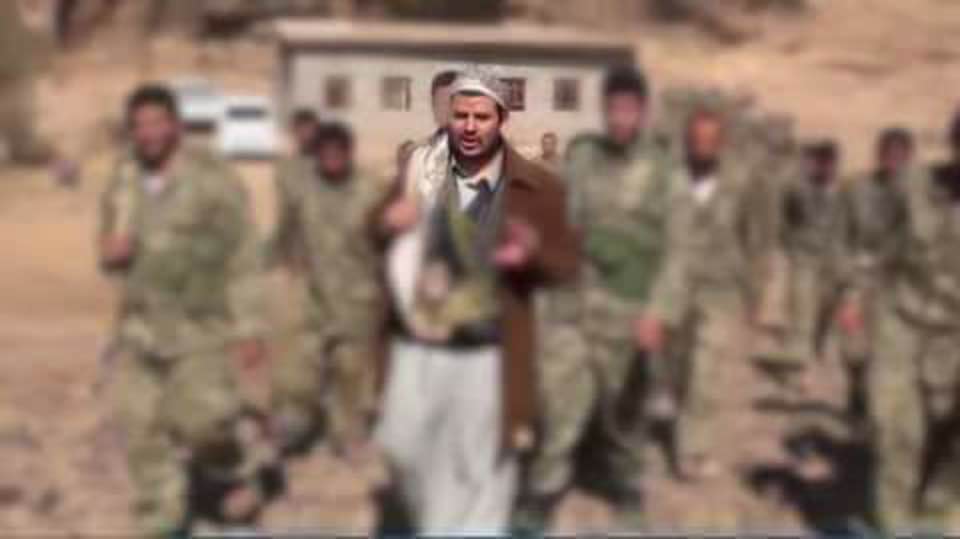 الصورة تظهر الحوثي مرتدياً سلاحه رافقه عدد من المسلحين المرتدين زي الحرس الجمهوري يقال انها في احدى الجبهات.