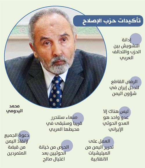 وأضاف اليدومي أنه سبق للحزب أن تبرأ من أي صوت من داخله يسعى لشق الصف أو إصدار آراء تخالف توجهاته مع التحالف، معبرا عن رفضه لأن تكون اليمن مسرحاً للمخططات الإيرانية، مؤكدا أن صنعاء قريباً ستتحرر من العصابات الحوثية، وستبقى في محيطها العربي، وسيعود الاستقرار والأمن، وستكون عصية على كل من حاول المساس بأمنها واستقرارها، أو سعى إلى تفريق صفها وكيانها.