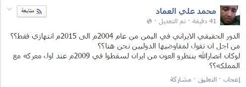 وقال العماد في صفحته على "الفيسبوك" أن الدور الحقيقي الايراني في اليمن من عام 2004م الى 2015م انتهازي فقط..