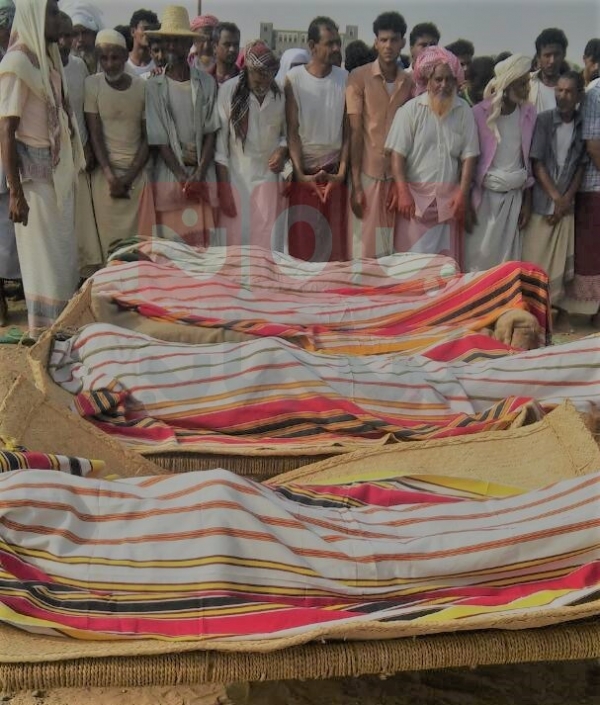 وقالت مصادر محلية "ان المدنيين قتلوا بالغارة الجوية في ساعات الفجر قبل أن تشرق الشمس في احدى مزارع قرية السادة في مديرية حيران (15 كيلو عن مركز المحافظة) بينما كانوا يعملون في مزارعهم".