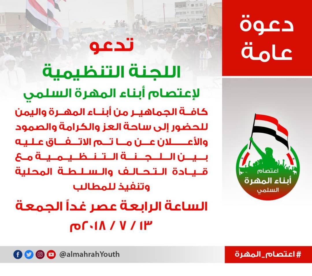 ويأتي ذلك بعد 17 يوم من الاعتصام السلمي المفتوح الذي اعلنه أبناء المهرة منذ (25 يونيو 2018) الماضي، ويطالب أبناء المهرة في الاعتصام بالتمسك بالقيادة الشرعية وضرورة تسليم مطار الغيضة وميناء نشطون البحري والمنافذ البرية شحن وصرفيت للجهات الأمنية والعسكرية التابعة للشرعية .