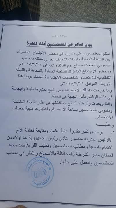 فقد قررنا ( تعليق الاعتصام من يوم الجمعة الموافق 13 / 7 / 2018م وبحسب الاتفاق المشار إليه مع قيادة السلطة المحلية وقوات التحالف العربي ممثلة بالجانب السعودي ولكننا نؤكد لجميع ابناء المحافظة بأنه وفي حالة عدم تنفيذ المطالب خلال مدة شهرين من تاريخه حسب الاتفاق وما ورد في المحضرين المشار إليهما فإننا سنعود إلى اعتصامنا مرة اخرى مع رفع سقف المطالب مباشرة ونحث اللجنة المكلفة بمتابعة تنفيذ المطالب الستة مع الجهات المختصة والعمل على تنفيذ مطالبنا التي اصبحت مطالب كل ابناء المحافظة