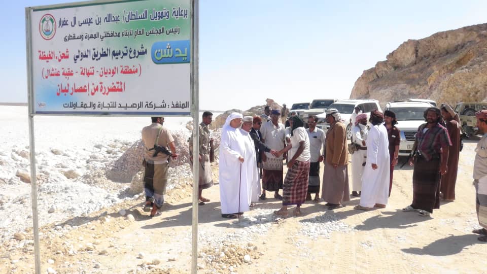 في بداية التدشين أكد السلطان بن عفرار على اننا في تواصل وتنسيق مع السلطة المحلية في المحافظة في تنفيذ مشروع إعادة ترميم وسفلتة الطرق المتضررة كما شكر قيادة السلطة المحلية على تذليل الصعوبات و التسهيلات التي قدمتها في تسهيل دخول المعدات من المنافذ الحدودية مع عمان التابعة لشركة الرصيد للتجارة والمقاولات لشيخ عثمان رعفيت لتبدأ العمل في ترميم وسفلتة الطريق وأشار السلطان بن عفرار على الاستمرار في تقديم الدعم لمحافظة المهرة حيث قدمنا 22 ألف ريال عماني لحملة منزل وأيضا قدمنا ألف حالة للشؤون الإجتماعية بمخصص شهري وليست اخيرا أن شالله المكرمة التي أعلنت عنها مبلغ مليون ريال عماني للمهرة وسقطرى وخصص منها 600 ألف ريال عماني لمحافظة المهرة للمساهمة في معالجة الأضرار الناجمة عن إعصار لبان وبإذن الله سنستمر في مواصلة الدعم في كل المجالات