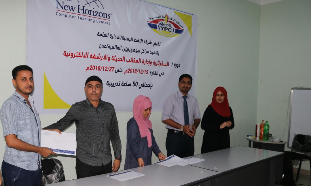 اختتام موظفين من الشركة لدورة تدريبية في السكرتارية والارشفة الالكترونية بمراكز نيوهورايزن في عدن