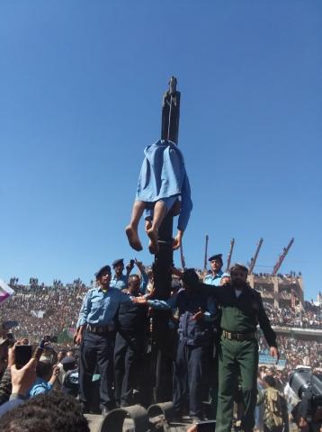 وبعد عملية الإعدام التي تمت رميا بالرصاص تم التعزير بجثته بتعليقها على رافعة وسط حضور صيحات التكبير والتهليل من الآلاف من المواطنين.