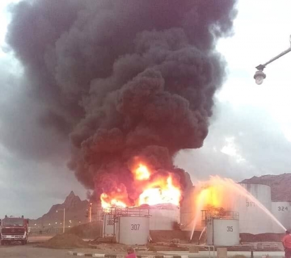 وقالت مصادر محلية "إن حريق هائل التهم خزان جديد للوقود في مصافي مدينة عدن بعد أن عجزت السلطات عن اخماد الحريق بشكل كلي منذ مساء أمس الجمعة".