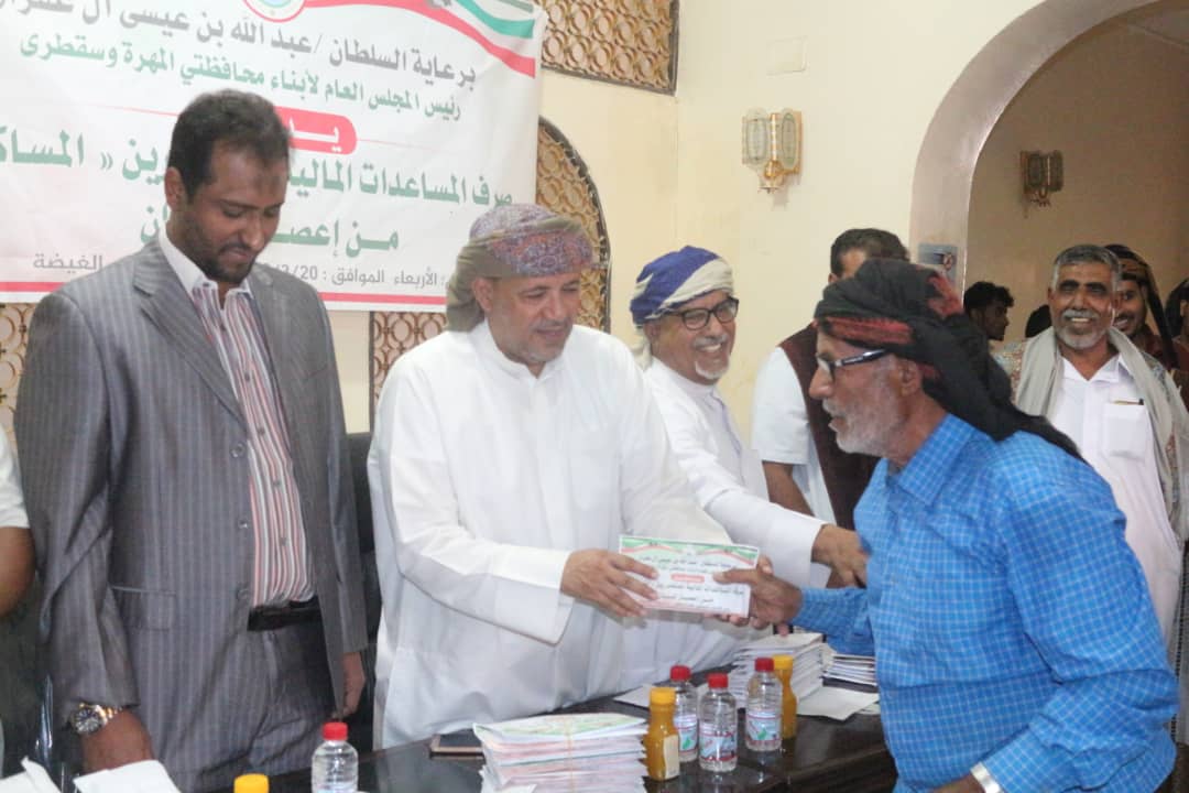دشن السلطان عبدالله بن عيسى آل عفرار رئيس المجلس العام لأبناء محافظتي المهرة وسقطرى صباح اليوم الأربعاء في مقر المجلس العام , عملية صرف المساعدات المالية للأسر التي تهدمت منازلهم جرى إعصار لبان الذي اجتاح محافظة المهرة في منتصف شهر أكتوبر عام 2018 , بحضور الشيخ توكل سالم ياسين عضو مجلس الشورى رئيس الهيئة التنفيذية للمجلس العام والاستاذ مختار بن عويض الجعفري وكيل أول محافظة المهرة ومدراء عموم المديريات بالمحافظة . وأعضاء من الامانة العامة للمجلس العام