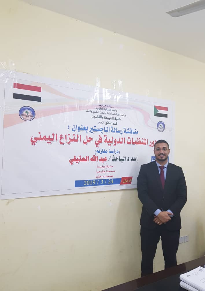 جامعة إفريقيا تمنح الماجستيرللباحث عبدالله عبده الحذيفي في القانون الدولي والعلاقات الدولية