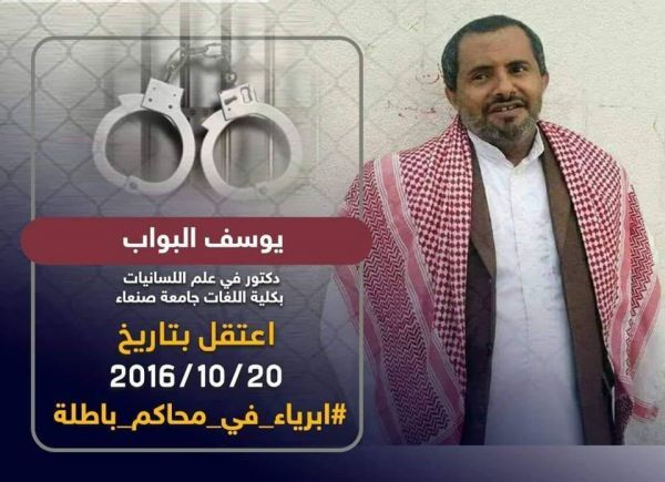 يتلقى الأكاديمي اليمني يوسف البواب صنوف التعذيب في سجون ميليشيا الحوثي منذ اختطافه في 20 أكتوبر 2016، بعد عودته من صلاة العشاء في جامع الدرة بمنطقة سواد حنش وسط العاصمة صنعاء.