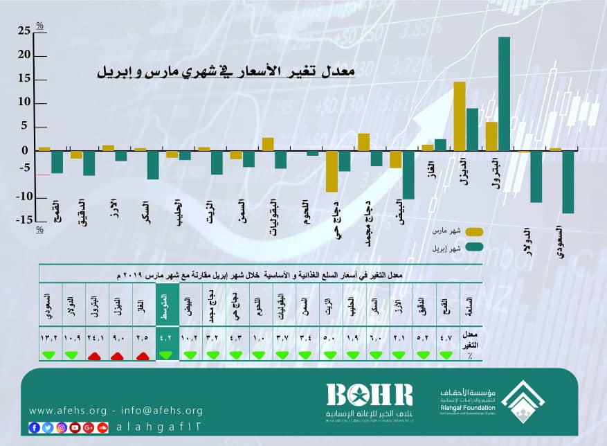 هذا وقد أوضح تقرير صادر عن مؤسسة الأحقاف للتقييم والدراسات الانسانية وفقا للنشرة الشهرية الممولة من ائتلاف الخير للإغاثة الانسانية مراقبة حالة الأسعار خلال شهر ابريل الذي امتاز بالتراجع البسيط حتى يوم 25 ابريل مقارنة بشهر مارس وقد تناول التالي: