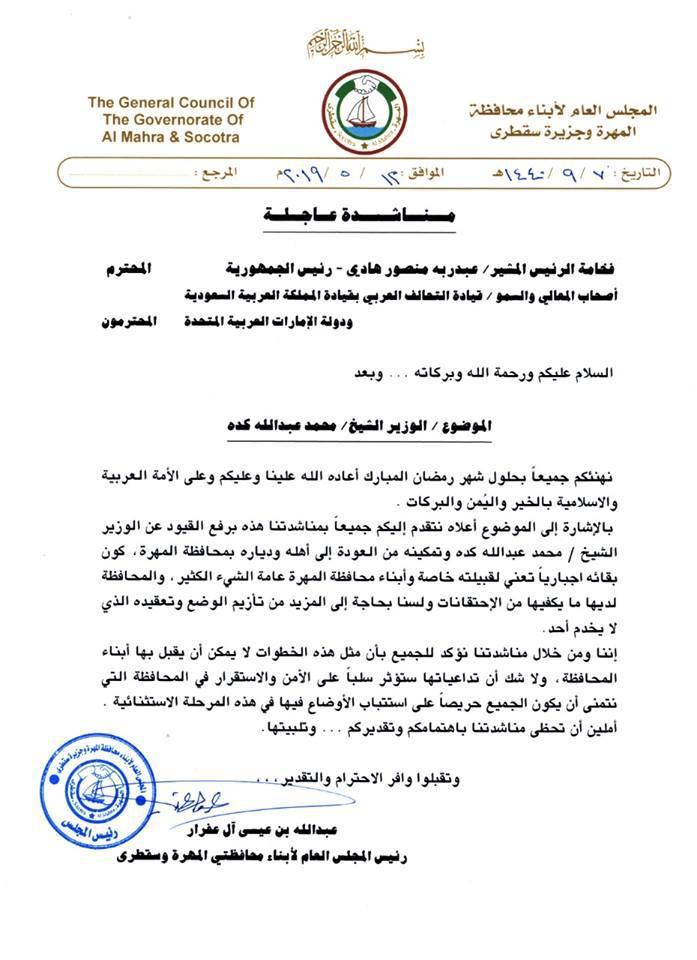 ناشد السلطان عبدالله بن عيسى آل عفرار رئيس المجلس العام لأبناء محافظتي المهرة وسقطرى الرئيس عبدربه منصور هادي، وقيادة التحالف العربي الذي تقوده السعودية، مطالباً برفع القيود عن الوزير بن كده ليتمكن من العودة إلى دياره في محافظة المهرة.