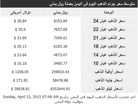 تحتوي الصفحة على تقرير بأسعار معدن الذهب، اليوم الأحد، في اليمن، بالريال اليمني و الدولار الأمريكي.