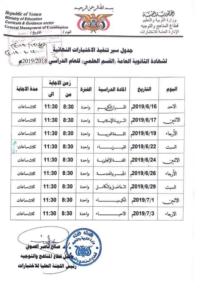 صنعاء وعدن تجريان امتحانات الثانوية العامة الاحد المقبل (جدول الامتحانات)
