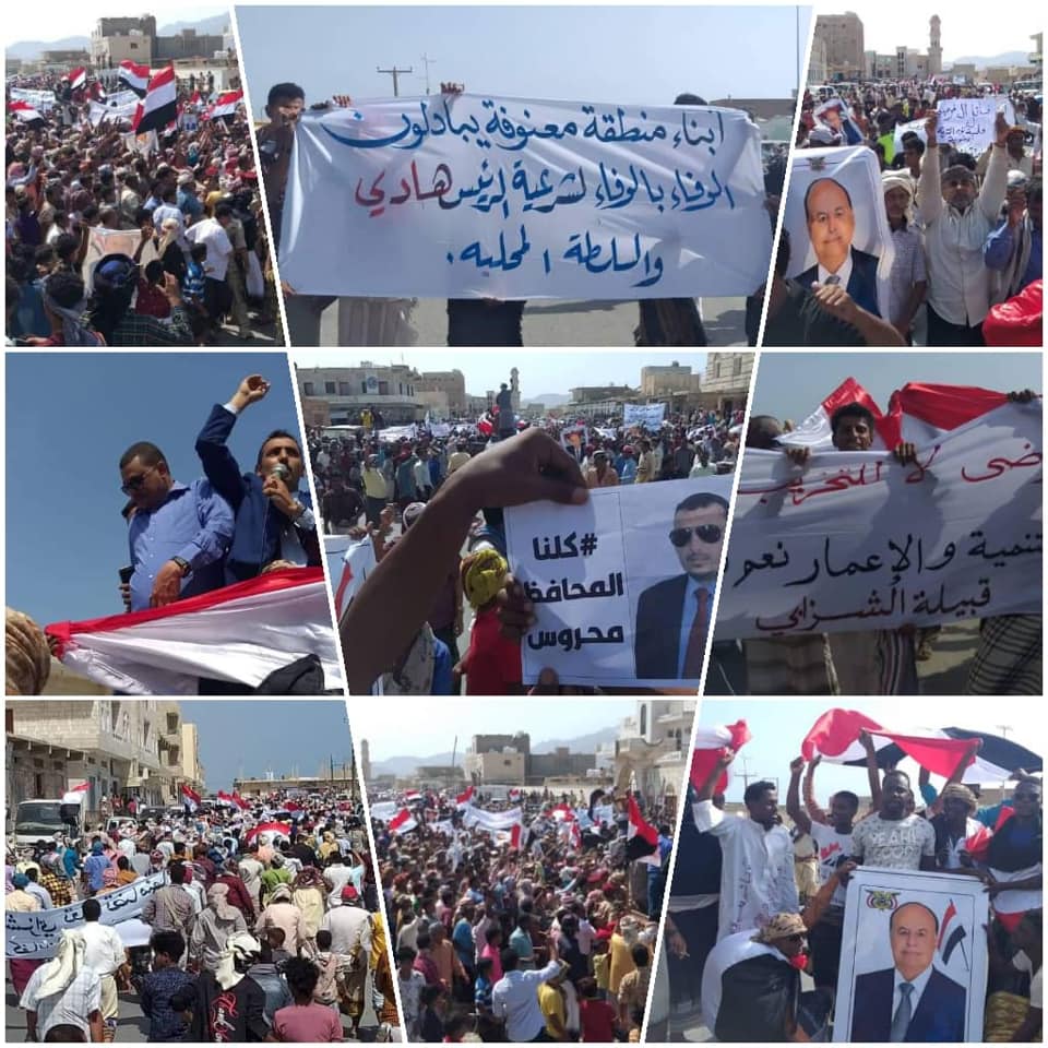 اقيم صباح اليوم بمدينة حديبوه عاصمة محافظة ارخبيل سقطرى مظاهرة جماهيرية حاشدة للآلاف من أبناء سقطرى دعما لشرعية الرئيس عبدربه منصور هادي ومساندة للسلطة المحلية بقيادة المحافظ رمزي احمد سعيد محروس. وقال رمزي محروس محافظ سقطرى كلمته أمام الجماهير المحتشدة أن محافظة ارخبيل سقطرى تجدد تمسكها الدائم والمستمر بالشرعية بقيادة المشير عبدربه منصور هادي الذي يولي الأرخبيل عناية خاصة وهاهم سكان أرخبيل سقطرى يؤكدون تمسكهم بالدولة وانحيازهم للسلطة الشرعية ورفضهم لأي تشكيلات خارجةعن القانون والاطار الشرعي. وقدم محروس شكره وتقديره لدول التحالف العربي لدعم الشرعية على وقوفهم مع اليمن ودعمهم المستمر نحو دحر الانقلاب الحوثي واستعادة الشرعية. ورفع المتظاهرون شكرهم وتقديرهم للرئيس هادي لاهتمامه المستمر والمميز بمحافظة أرخبيل سقطرى مجددين العهد والالتزام بالوقوف مع الشرعية بقيادته حتى تحرير كل من شبر من الوطن من جماعة الحوثي واستعادة كرامة الوطن وسيادته. كما حيا المتظاهرون التحالف العربي بقيادة المملكة العربية السعودية مؤكدين في الوقت نفسه على دوره المساند والداعم للشرعية في اليمن وللسلطة المحلية في أرخبيل سقطرى معبرين عن الشكر والتقدير لذلك الدعم والمساندة. كما تقدم المتظاهرون للقوات المسلحة الأمن بالشكر على الجهود المبذولة لحفظ النظام والقانون وحماية مؤسسات الدولة وفرض الأمن والسلام في المحافظة داعين الى مزيد من الجهود في هذ الاتجاه مؤكدين رفض تشكيل أحزمة أمنية وأي تشكيلات عسكرية خارج نطاق الدولة اذ لا حاجة لمثل هذه التشكيلات في أرخبيل وبوجود القوات المسلحة والأمن التي تقوم بدورها على أكمل وجه. كما استنكر المتظاهرون الدعوات والشعارات الداعية الى تمزيق المجتمع السقطري وبث الفرقة والشقاق بين أبنائه مؤكدين انها دعوات مغرضة وسلوك دخيل على عادات وتقاليد المجتمع السقطري داعيين في الوقت نفسه شيوخ وأعيان المجتمع الى تحمل المسئولية المناطة بهم في الحفاظ على تماسك المجتمع السقطري وارساء مبدأ التعايش والتعاون بين شرائحه ومكوناته والوقوف أمام محاولات بث الفتنة والانقسام ونشر الفوضى والتخريب. وجابت المسيرة الجماهيرية شوارع حديبوه مرددين شعارات تؤكد على تمسكهم باليمن الاتحادي ومخرجات الحوار الوطني رافعين اعلام اليمن وصور الرئيس هادي ولافتات تدعو لرفض دعوات العنف ونبذ الكراهية ورفض تشكيل مليشيات خارجة عن النظام والقانون.