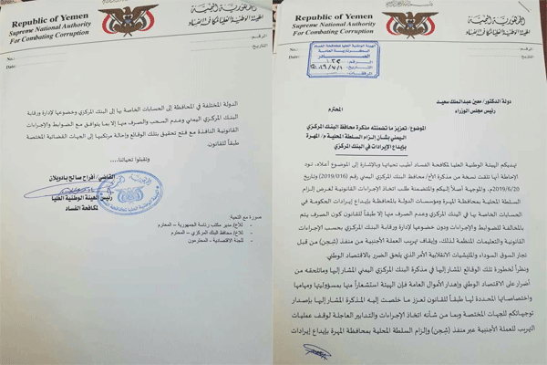 طالبت الهيئة الوطنية العليا لمكافحة الفساد، الحكومة اليمنية، اتخاذ التدابير العاجلة والاجراءات القانونية لإلزام السلطة المحلية بمحافظة المهرة ومؤسسات الدولة بالمحافظة بإيداع إيرادات الحكومة في الحسابات الخاصة بها في البنك المركزي وعدم الصرف منها إلا طبقا للقانون.