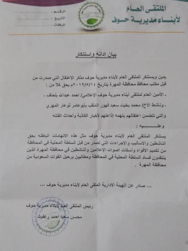 وقال الملتقى في بيان له إنه يدين ويستنكر مذكرة الاعتقال التي صدرت من قبل محافظ محافظة المهرة منتصف شهر مايو الماضي بحق الأمين العام لملتقي أبناء مديرية حوف "أحمد عبد الله بلحاف" والناشط "محمد بخيت سعيد" بتهمة إذاعة اخبار كاذبة واحداث الفتنة.