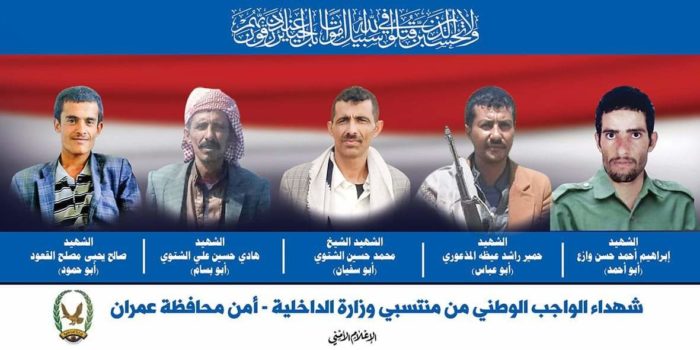 وزعمت الجماعة أنهم قتلوا خلال قيامهم بواجبهم الأمني في مواجهة “مجاهد قشيرة ” ومسلحيه في مديرية ريدة بمحافظة عمران.