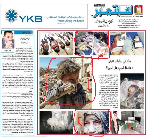 الاسبوع الماضي نشرت صحيفة 26 سبتمبر صوراً قالت انها لقتلى قصف طيران التحالف، وصور للدمار.