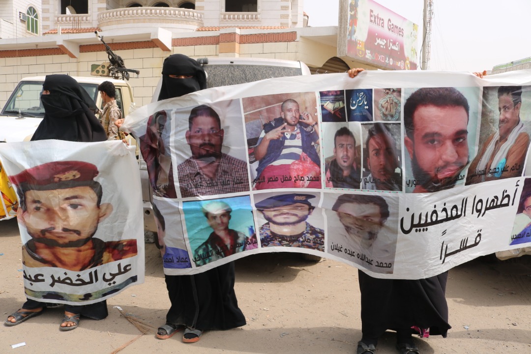 وفي الوقفة رفعت الأمهات وزوجات المخفيين لافتات وصور أبنائهن وأزواجهن المخفيين في السجون السرية منذ عدة سنوات مطالبات رئيس الجمهورية ووزير الداخلية والتحالف العربي بالكشف عن مصير أبنائهن .