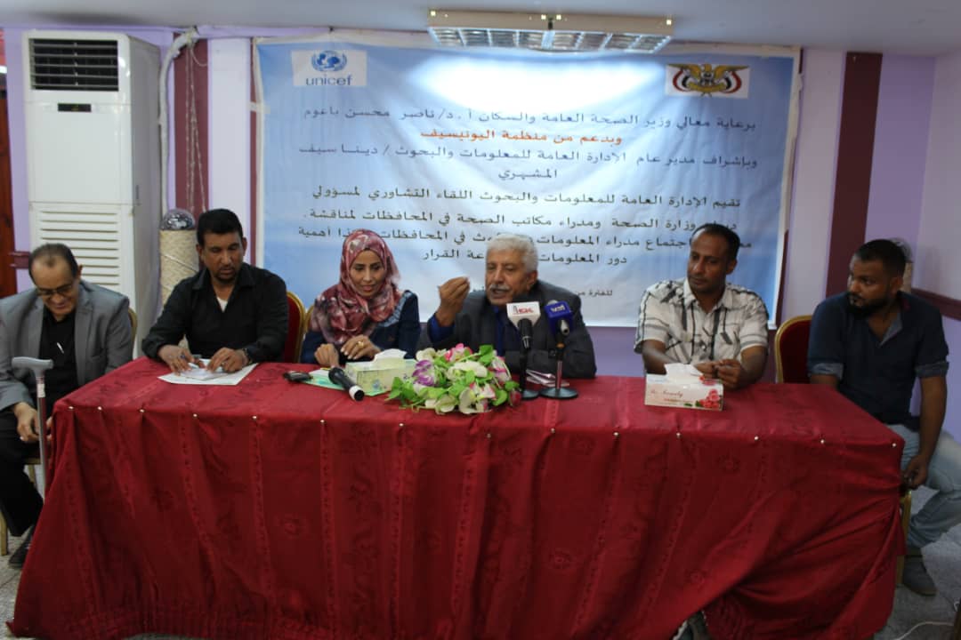 اللقاء الذي تنظمة الادارة العامة للمعلومات والبحوث بوزارة الصحة وبدعم من اليونيسيف يشارك فية اربعة عشر محافظة بالاضافه الي كادرات الوزارة وسيناقش علي مدي يومين مسودة تحديات ومعوقات نظم المعلومات الصحية ووضع الحلول تمهيدا لانشاء النظام المعلوماتي الصحي الشامل .