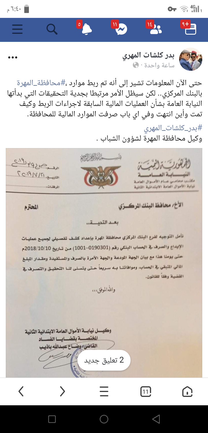 هذا وأصدرت النيابة عدد من المذكرات للتحقيق مع محافظ المحافظة لتصرفات بموارد المهرة دون الرجوع للحكومة وربط مركزي المهرة بالبنك المركزي بعدن.