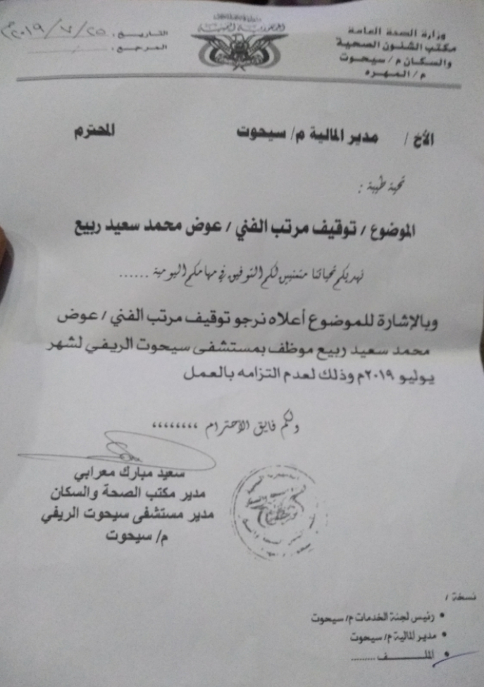 أوقف مدير مكتب الصحه والسكان بمديرية سيحوت سعيد مبارك معرابي راتب الموظف الفني عوض محمدسعيد ربيع وذلك على خلفية نشاطه الاعلامي في مواقع التواصل الاجتماعي المساند لإبناء المهره في،نضالهم السلمي.