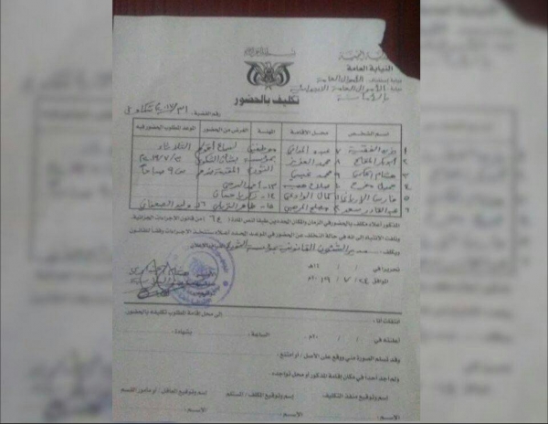 وأصدرت النيابة الخاضعة للحوثيين في 24 يوليو الجاري، تكليفاً بإحضار 16 صحفياً وموظفا بمؤسسة الثورة للصحافة، اليوم الثلاثاء إلى النيابة للتحقيق، في شكوى مرفوعة ضدهم.