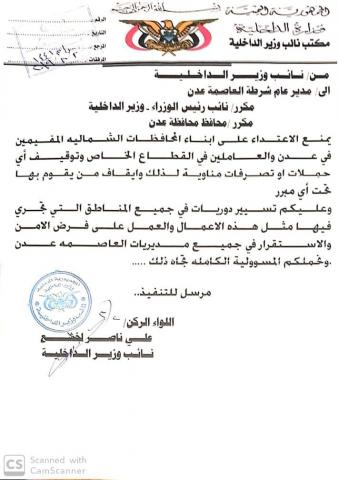 وجه نائب وزير الداخلية بالحكومة اليمنية المعترف بها، اللواء الركن علي ناصر لخشع مدير شرطة عدن اللواء شلال شائع بمنع الاعتداء على أبناء المحافظات الشمالية.