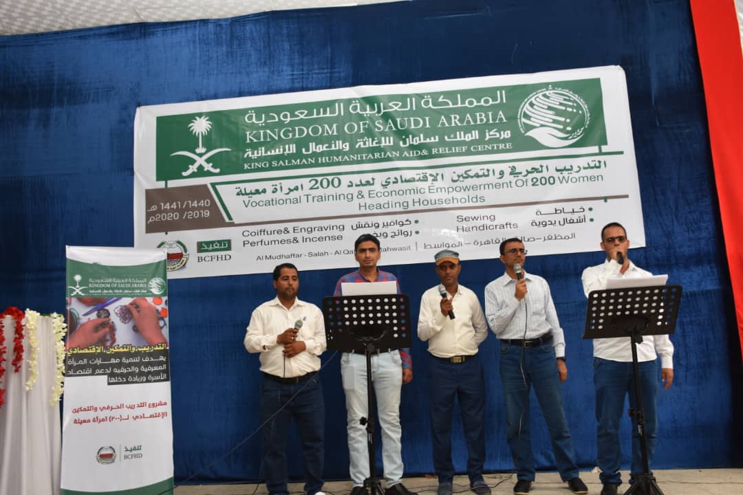 دشن مركز الملك سلمان للاغاثة والاعمال الانسانية بمحافظة تعز اليوم الخميس 1 اغسطس برنامج التدريب الحرفي والتمكين الاقتصادي للمراة المعيلة والذي تستفيد منه 200 امراة معيلة عبر شريكه المحلي BCFHD في المحافظة بحضور الأستاذ عبده علي مدير مكتب الشؤون الاجتماعية بتعز والاستاذ محمد عبدالله المدير التنفيذي للجنة الفرعية للإغاثة .