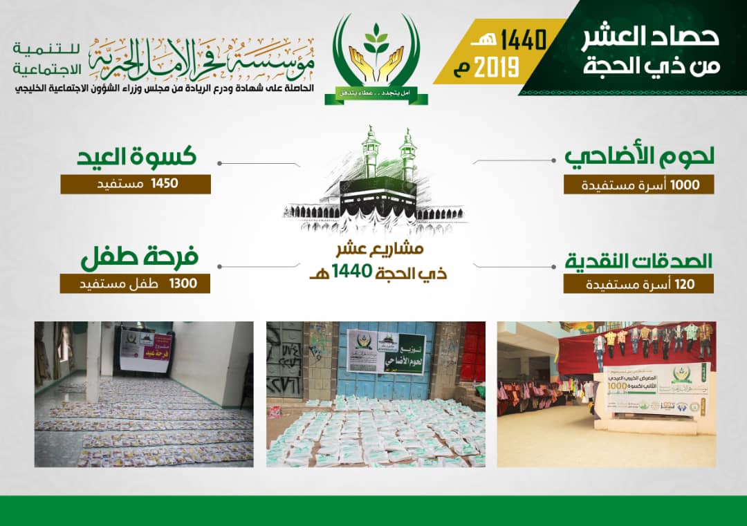 وتمثلت مشاريع العشر والعيد بتوزيع لحوم الاضاحي وكسوة العيد وتوزيع الصدقات النقدية وبرنامج فرحة عيد للأطفال