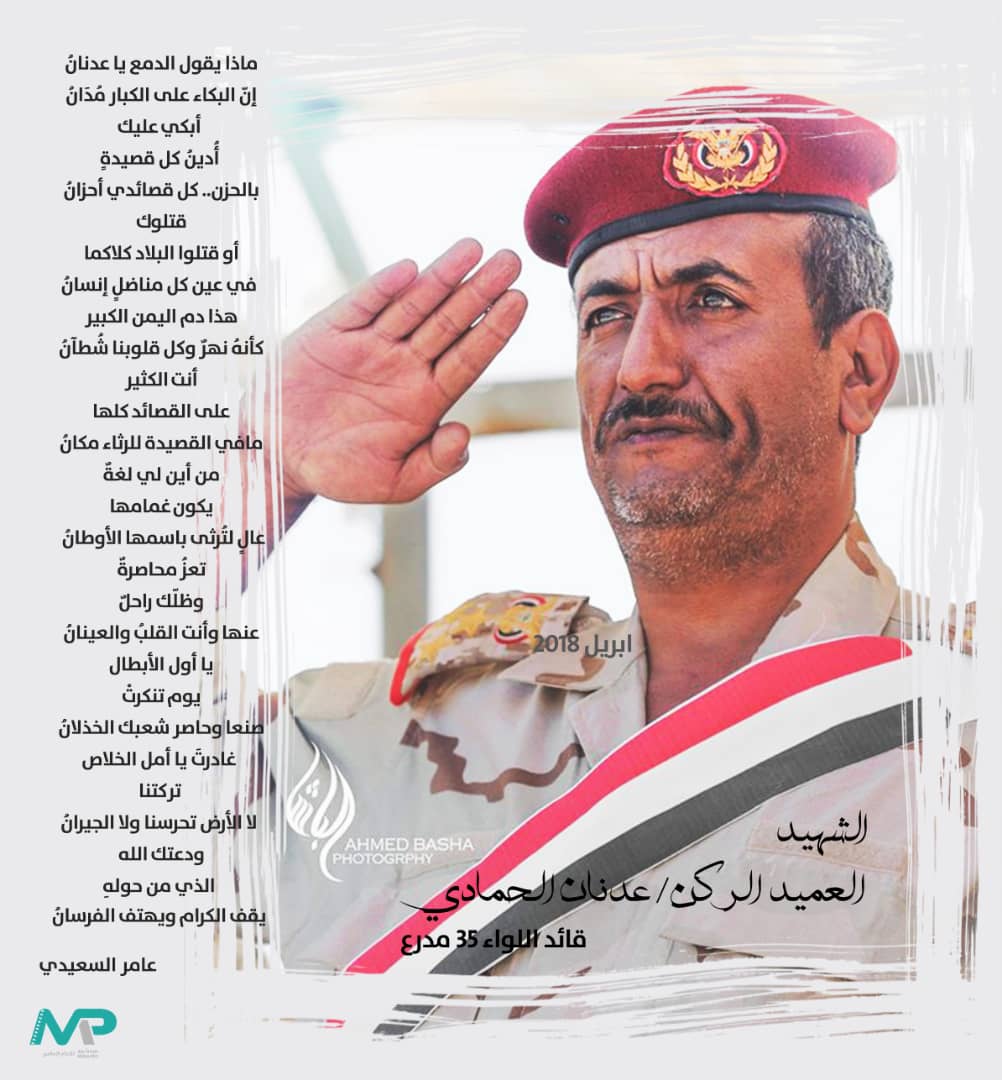 نعى قائد المقاومة الشعبية الشيخ حمود سعيد المخلافي إستشهاد قائد اللواء 35 مدرع بتعز العميد الركن عدنان الحمادي .