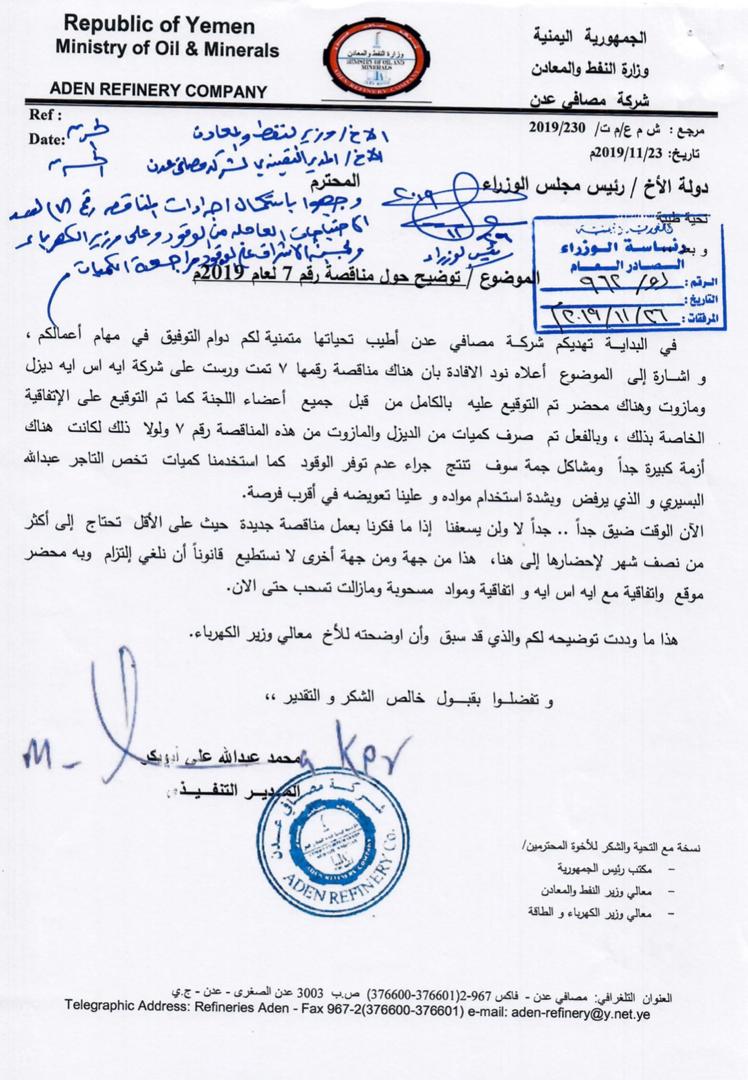 وأشار المصدر الى ان ما ساقه معين عبدالملك من السطحية في تناوله للأمر لا يرتقي الى أدنى مستويات المسؤولية والمصداقية، حيث أن السبب الرئيسي فيما تم تناوله يرجع الى تخبط الحكومة في التعامل مع المناقصة رقم 7 والتي اعلن عنها في شهر 7 /2019م، ورست على شركة ايه اس ايه التابعة للمجموعة وفق الإجراءات القانونية التي تمت أثناء الأحداث الأخيرة التي شهدتها العاصمة المؤقتة عدن في اغسطس الماضي، وبناء على خطاب المدير التنفيذي لمصافي عدن فقد وجه رئيس الوزراء بخط يده باستكمال إجراءات المناقصة رقم (7) لسـد الاحتياجات العاجلة من الوقود (بحسب الوثيقة المرفقة)، وبما ان الشركة لديها التزامات للشركات الموردة وتتعرض لضغوط لسداد قيمة المشتقات المستوردة لصالح الحكومة فقد أعطت الحق للحكومة بعمل ما تراه مناسبا سواء بإلغاء المناقصة او عمل مناقصة جديدة، وذكرت الشركة انها تتطلع لقيام الحكومة بسداد جزء من المديونية المستحقة لها لدى وزارة الكهرباء والبالغة ١٤٠ مليون دولار، (مرفق)، بالإضافة الى مديونيات أخرى تقدر بمئات الملايين من الدولارات لدى وزارة الداخلية ووزارة الدفاع ومديونية فرع وزارة الكهرباء بمحافظة شبوة التي مولتها الشركة بناء على التزام رئيس الوزراء بتسديد المديونية خلال أسبوع من تاريخ التفريغ وهو ما لم يحدث حتى اللحظة.