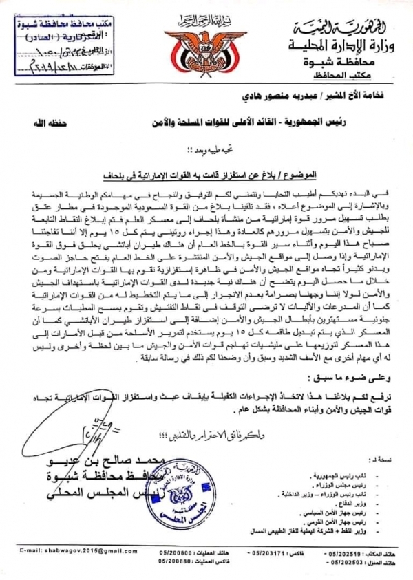 وأكدت الرسالة أن السلطة المحلية تلقت بلاغاً من القوات السعودية في المحافظة بإبلاغ النقاط التابعة للأمن والجيش بتسهيل مرور القوات الإماراتية كالعادة وهذا اجراء روتيني يتم كل 15 يوم.