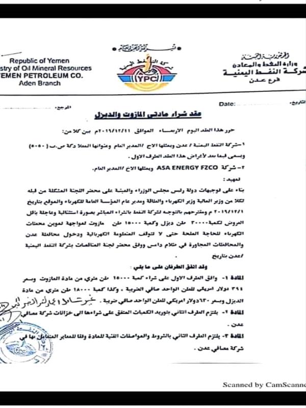 واضاف : المفضوح معين بعد أسبوع واحد فقط على تمرير الشحنة الأولى للشركة المجهولة وجه بالتعاقد مع شركة ايه اس ايه التابعه للعيسي التي قال انها تحتكر استيراد المشتقات النفطيه لشراء دفعة اخرى من مادة الديزل لكهرباء عدن ولكن كان التعاقد مع شركة ايه اس ايه بسعر 630 دولار للطن المتري من مادة الديزل أي بأقل من سعر الشحنة السابقة ب60 دولار للطن الواحد..تخيلو الشركة التي قال معين انها محتكرة السوق وانه جاء ليحرر السوق من احتكارها وفرت الديزل بسعر أقل من شركة عمته شفيقه التي قال انها ستوفر الوقود باسعار اقل..!! وبلغ الفارغ في الشحنة الأولى اكثر من 300 الف دولار...فلمن ذهب هذا الفارغ..