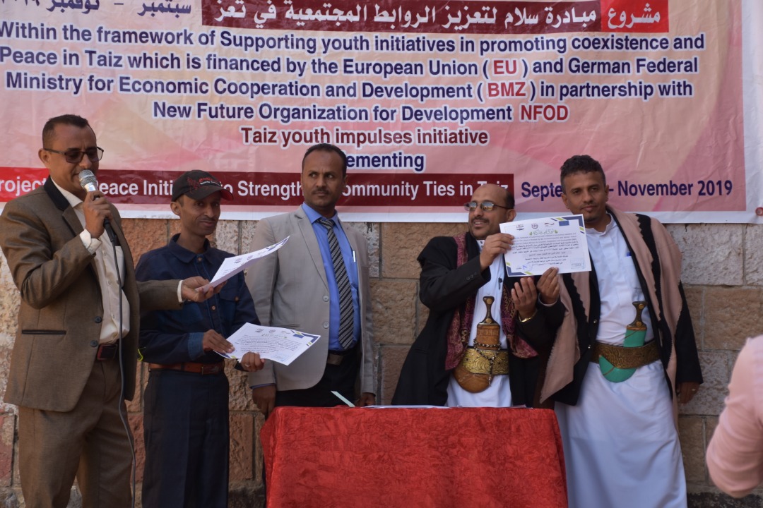 اقامت مبادرة " نبضات تعز " الشبابية الحفل الختامي لمشروع مبادرة سلام لتعزيز الروابط المجتمعيه صباح اليوم في ساحة مدرسة 26 سبتمبر بمحافظة تعز وذلك في إطار مشروع دعم المبادرات الشبابية لتعزيز سبل التعايش والسلام في محافظة تعز الممول من الوزارة الاتحادية الالمانية للتعاون الإقتصادي والتنمية (BMZ) والإتحاد الأوربي (EU) وبالشراكة مع منظمة مستقبل جديد للتنمية (NFOD) .