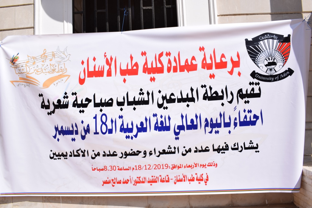أقامت صباح اليوم رابطة المبدعين الشباب فعالية شعرية؛ احتفاء باليوم العالمي للغة العربية الثامن عشر من ديسمبر ، شارك فيها عدد من الشعراء والأكاديميين، وذلك في قاعة الفقيد الدكتور أحمد صالح منصر في كلية طب الأسنان جامعة عدن، ابتدأت الفعالية بكلمة رئيس رابطة المبدعين الشباب أبوبكر الهاشمي عبر فيها عن سعادته بهذه الفعالية إذ تأتي في مناسبة عظيمة ويوم عالمي للغتنا الأم ،لذلك يجب على الجميع الاهتمام بها، وفي نهاية كلمته شكر الجميع على حضورهم، تلته كلمة ا.د محمد السقاف عميد كلية طب الأسنان راعي الفعالية رحب فيها بالجميع، معرجا على أهمية اللغة العربية، ودور الجامعة في المحافظة عليها وذلك بإقامة الندوات وتشجيع مثل هذه الفعاليات، تلت كلمته كلمة الأستاذ الدكتور عبد الحكيم صالح باقيس رئيس مركز الظفاري للدراسات والبحوث، ورئيس نادي السرد عدن، أشاد بكلمته بدور الرابطة ونشاطها الثقافي،مؤكدًا على أهمية مثل هذه الفعاليات ويجب رعايتها، كما تحدث عن بداية تأريخ إعلان اليوم العالمي للغة العربية، وأهمية هذا اليوم إذ يعد تكريمًا وإنصافًا للغة العربية حيث تم إقراره من قبل الجمعية العامة للأمم المتحدة بقرارها رقم 3190 في 18 من ديسمبر من عام 1973 ،بدأ الاحتفال به رسميًا من قبل اليونسكو في عام 2012، وفي نهاية كلمته شكر للجميع حضورهم واهتماهم بتخليد هذا اليوم، تلته بداية الفعالية الشعرية بقصيدة الشاعر عبدالله الأحمدي نالت استحسان الحاضرين، بعدها كلمة الأستاذ بدر العرابي أمين عام اتحاد وكتاب الجنوب تحدث فيها عن تجربة الشباب وأثرها في الحفاظ على اللغة، وأن فترة الحرب أظهرت عدد من الشعراء لم يكونوا موجودين قبلها، وكل شاعر من هولاء يعتبر أداة من أدوات الحفاظ على اللغة، توالت بعده المشاركات الشعرية لعدد من الشعراء :جهاد العبادي، صابرين الحسني،سعيد الفريس، حسام الليثي، أعياد عامر، أنيس الدياني، صلاح الحقب، دعاء الأهدل، رفيدة عبدالحفيظ،واختتمت الفعالية بقصيدة الشاعر أبوبكر الهاشمي، ما يجدر ذكره أن هذه الفعالية تأتي بحضور وكيل وزارة التعليم العالي والبحث العلمي لقطاع البعثات د/ مازن الجفري، وعمادة كلية الآداب أ.د جمال الحسني، ورجل القانون الأستاذ الدكتور صالح الميسري، والأستاذ الدكتور عبدالناصر الوالي عضو هيئة الرئاسة رئيس المجلس الانتقالي في محافظة عدن وعدد من الكتاب والمهتمين بالشأن الثقافي وعدد من الطلاب.