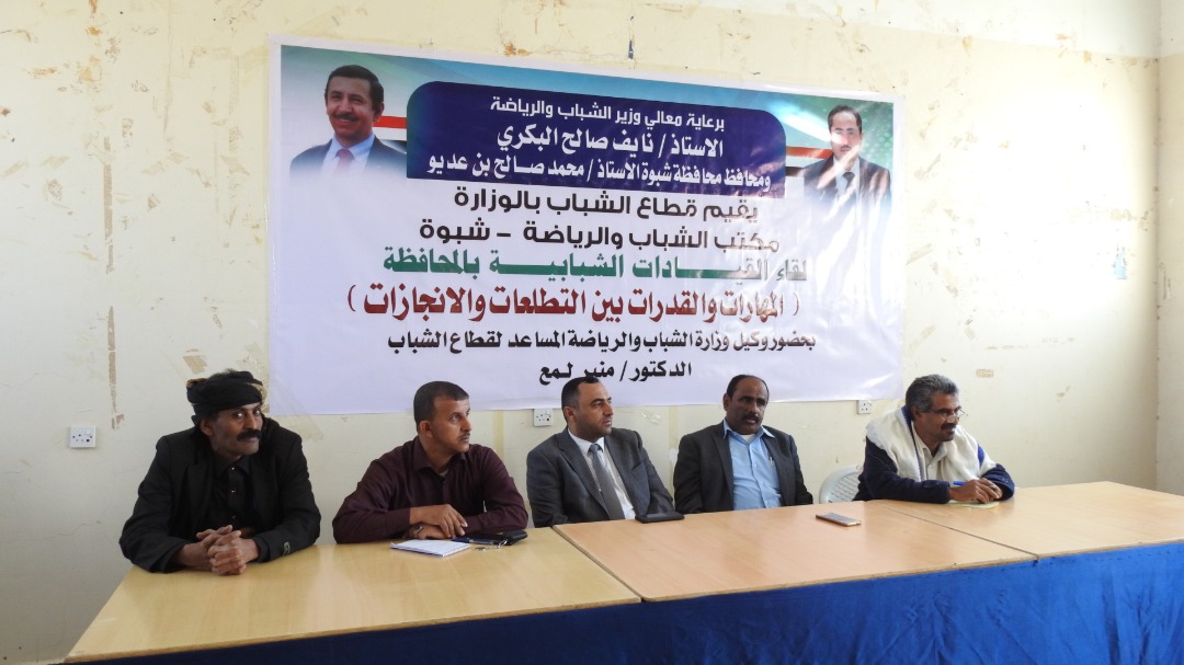 نظم قطاع الشباب بوزارة الشباب والرياضة اليوم في عتق بمحافظة شبوة لقاء للقيادات الشبابية بالمحافظة تحت شعار (المهارات والقدرات بين التطلعات والانجازات ).