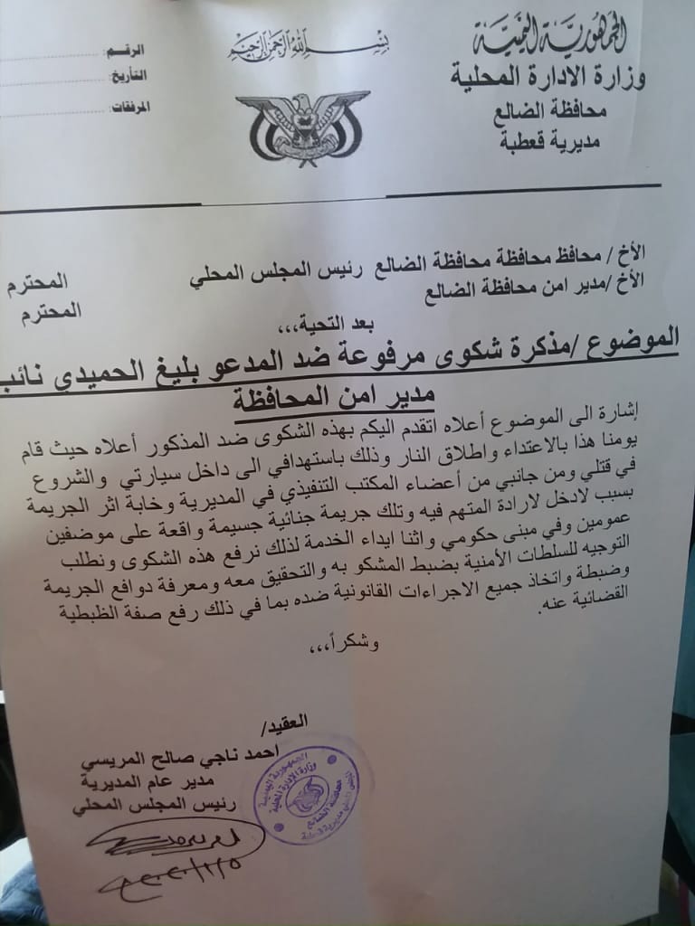 وفي بلاغ ومذكره رسميه رفعها مديرعام قعطبة الى محافظ الضالع ومديرامن محافظة الضالع اكد فيهابأن المدعوبليغ الحميدي قام بالاعتداء واطلاق النار واستهدافه الى داخل سيارته والشروع في قتله وبجانبه عددمن قيادات واعضاء المكتب التنفيذي بالمديرية اثناء تواجدهم داخل مبنى السلطه المحلية بالمديرية بغرض عقد اجتماع المكتب التنفيذي الشهري بالمديرية