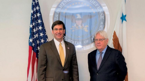 وكشف وزير الدفاع الأمريكي مارك إسبر عن اجتماع عقده أمس، مع المبعوث الأممي، في مقر وزارة الدفاع الأميركية (البنتاغون)، وأكد الوزير الأميركي في حسابه على موقع التواصل الاجتماعي "تويتر" دعم وزارة الدفاع الأميركية جهود الأمم المتحدة لإيجاد حل سلمي للصراع في اليمن لدعم الاستقرار الإقليمي.