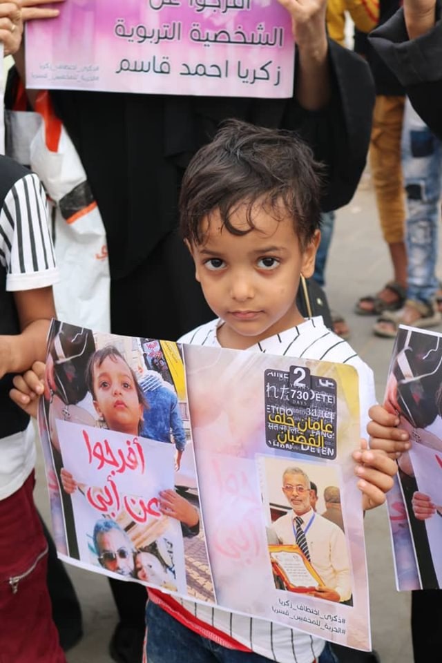 أمس الأول نظمت نشطاء حقوقيون ومتعاطفون مع عائلة المخفي قسرياً زكريا أحمد قاسم وطالبوا بالكشف عن مصيره، واتهمت عائلته مدير شرطة عدن العميد شلال شائع بالمسؤولية عن إخفائه كونه اعترف لهم بعد اعتقاله أنه موجود لديه ثم عاد وأنكر معرفته به.